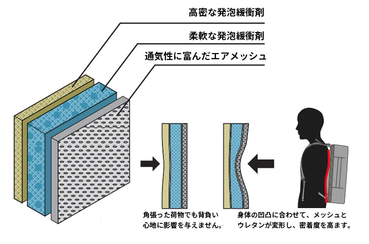 背面はエアメッシュと柔軟性に富んだ緩衝材と、高密でしっかりした発泡剤の3層芯構造。身体の凹凸に合わせて形状が追従し、密着度を高ます。PC等のガジェットを持ち運んでも、背負い心地に影響を与えにくい設計になっています。