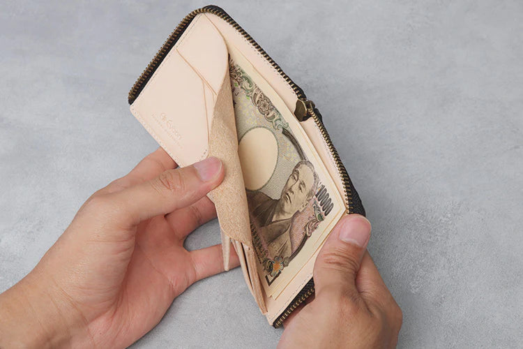 サイドの仕切りをカットしお札や領収書の出し入れをスムーズに。一般的な財布にはサイドの仕切りがついているものが多く、盲点だった箇所に着目しました。