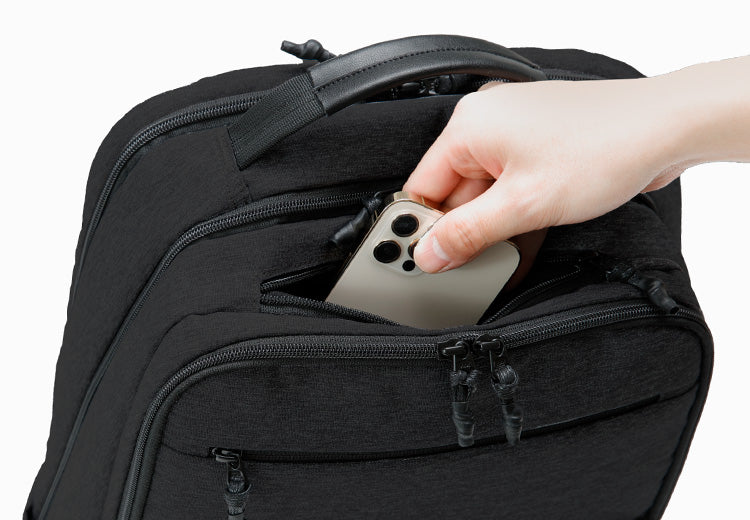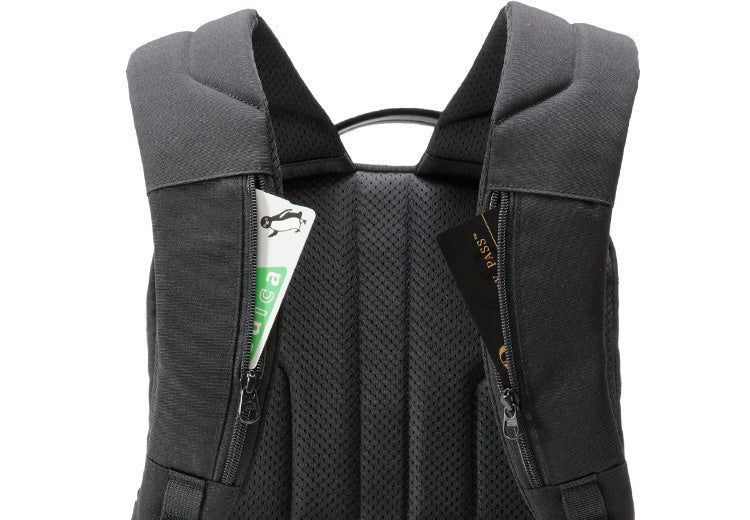 リュックを背負ったまま使用できるスマホサイズのポケットでクイックに収納物を出し入れ出来ます。背面に面しているためセキュリティポケットの役割にもなります。