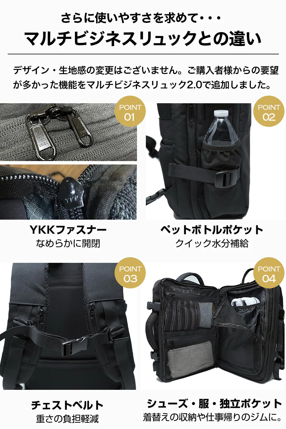街中でもよく見かけるようになり、ロングヒット中のマルチビジネスリュックシリーズ。こんな機能が欲しかったを凝縮した、マルチビジネスリュック第一世代に4個の嬉しいポイントをさらに凝縮。「理想的な機能性」「どんな場面でもどんな服装でもぴったりなデザイン性」を融合しました。”こんなリュックが欲しかった”をお楽しみください。マルチビジネスリュック2.0を体験頂きお客様の「生活・ビジネス」が、より豊かになっていただけるように心より願っております。