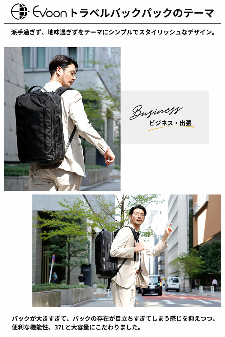 17.3インチのノートパソコンの収納や書類の整頓、それだけではなく泊りの出張や旅行・アウトドアにも最適。今回のEvoonは容量が37Lで主にトラベル向けに大容量にこだわりました。 圧倒的な収納力や使い勝手に喜びの声をこれまで多く頂いています。 これからは利用シーンによってバッグを使い分ける必要はなくなります。