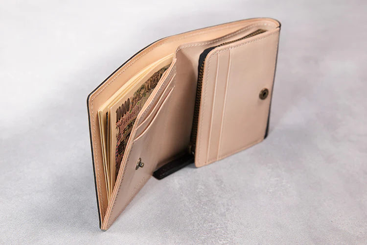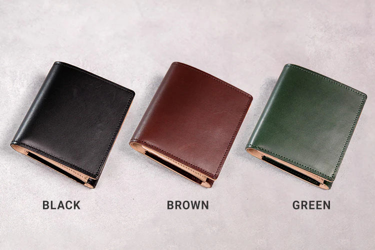 財布の定番、二つ折り財布。使いやすさ+デザイン性、そして、エイジングを楽しめる革を選定し、こだわりを凝縮し提供します。 お客様のビジネス、生活に深みを。そして豊かになることを心より願っております。