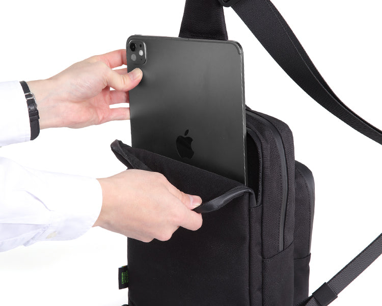 休日の外出やカフェなどでiPadを持っていきたい場合にリュックは大きすぎるが、サコッシュなどでは小さすぎるというお悩みに着目しサイズ感を設計しました。iPad 11インチの収納に最適なサイズで製作しました。iPad用の収納ポケットにはふわふわ生地を採用しているため、直接専用ポケットに収納可能です。