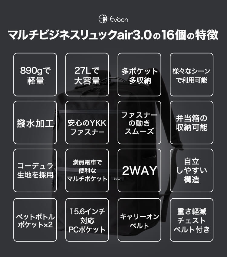 Evoon マルチビジネスリュックair3.0・容量27L【送料無料・3営業日以内に発送】