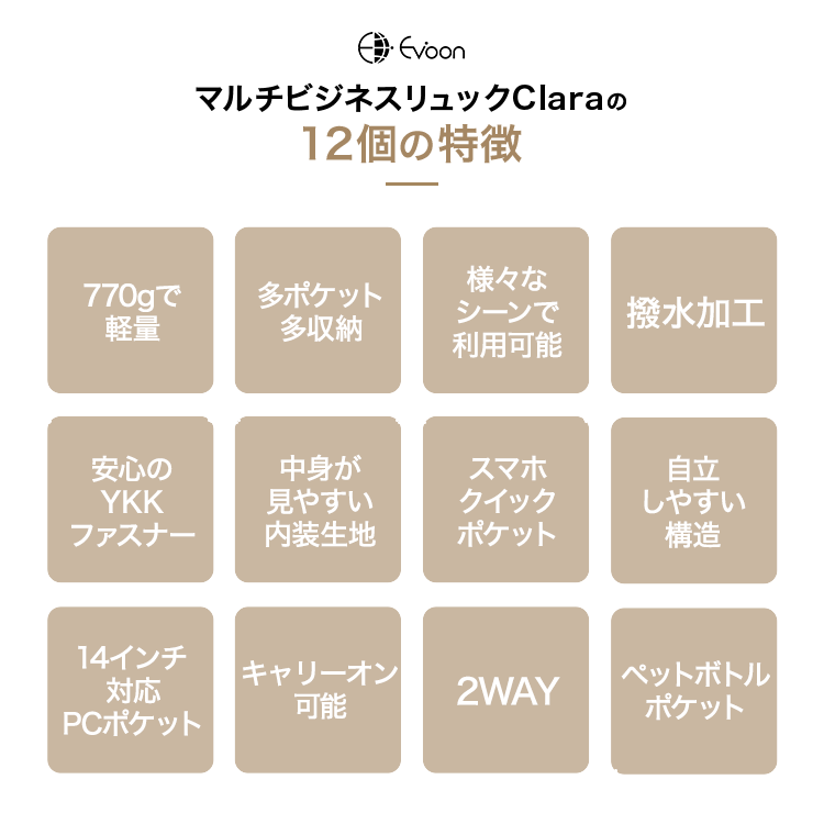 Evoon マルチビジネスリュックClara・容量14L【送料無料・3営業日以内に発送】