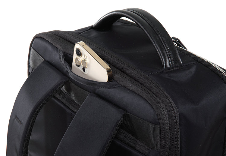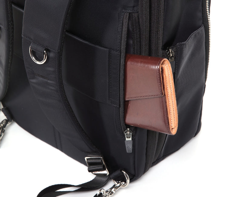 外にペットボトルを収納するのは見栄えが気になる。。そんなお悩みに着目して、外側からは収納しているペットボトルが見えない仕様のポケットも搭載しました。リュックの外側にペットボトルが見えない構造のボトルポケットを使うことでビジネスシーンをスマートにします。