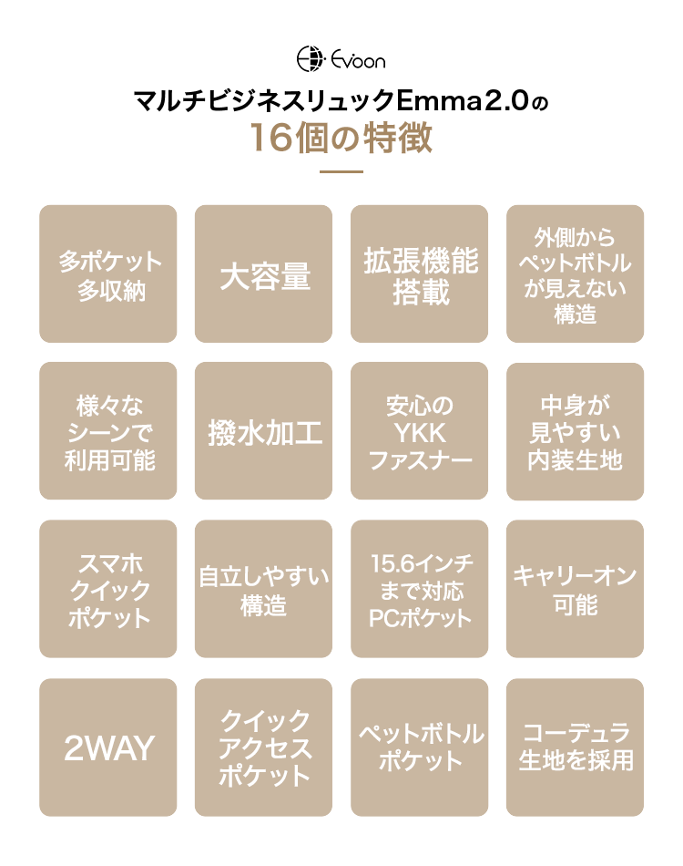 Evoon マルチビジネスリュックEmma2.0・容量19L~拡張時25L【間も無く予約受付開始・6月下旬までに入荷予定】