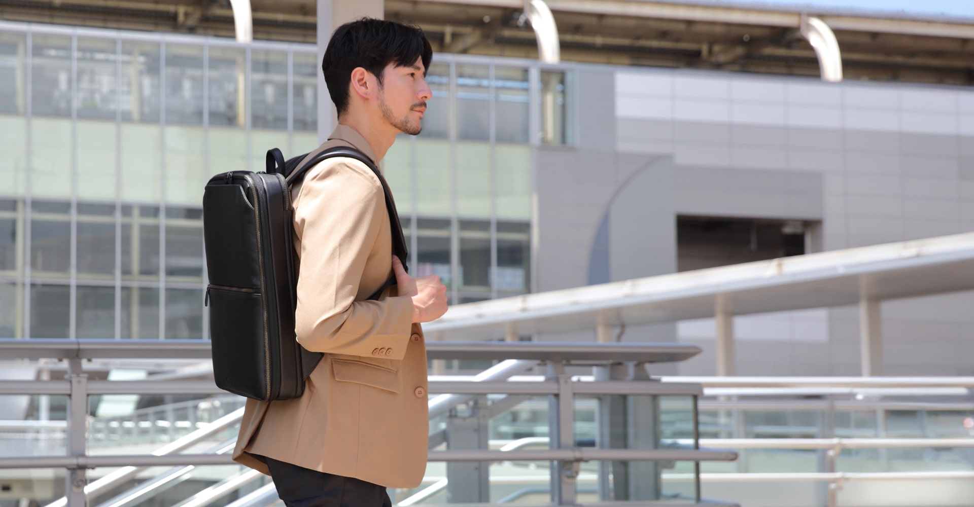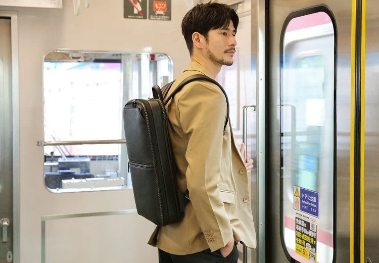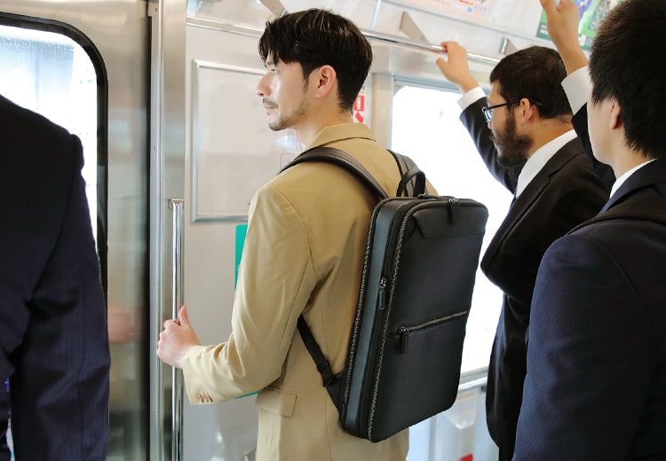 薄いリュックで周りへの配慮、自分自身の身動きのとりやすさが向上。満員電車での嫌な思いを軽減し、できるビジネスマンを演出します。
