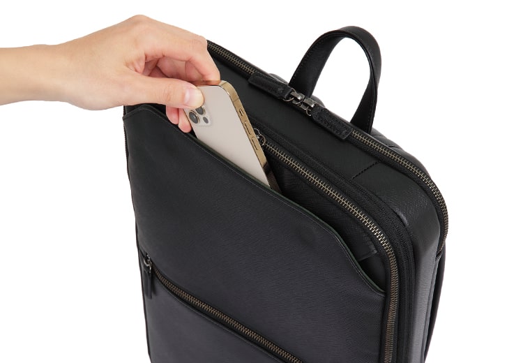 その悩みに着目し、薄いだけではなく、リュックを前抱きした際に使いやすいスマホのクイックアクセスポケットを搭載しました。