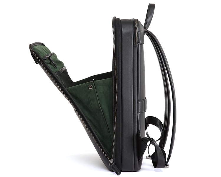 表面の革の高級感と内装のスウェード調の生地が高級感を引き立て、様々な利用シーンで活躍出来るシンプルでクールなデザイン。満員電車や通勤での利用を主に着目し薄さを極めたリュックをお届けします。