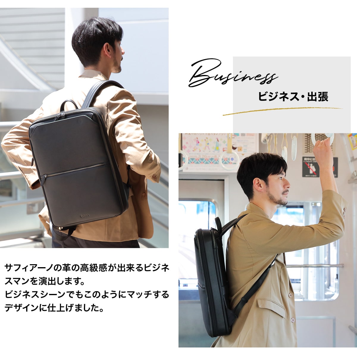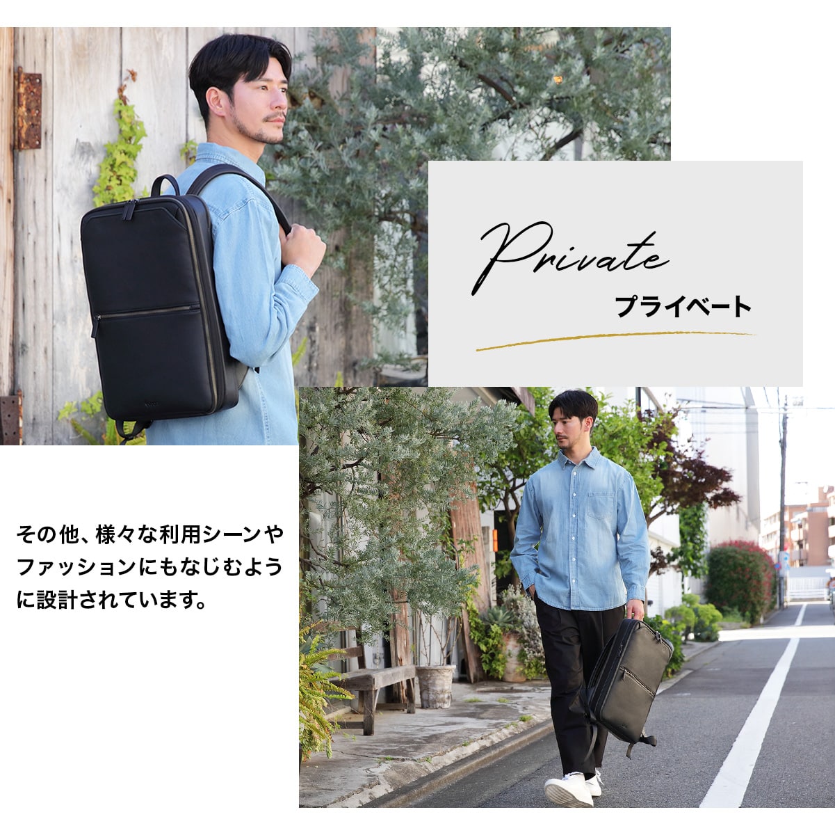 ビジネスやプライベートに必要なアイテムを想定し設計されたサイズ感で、薄いのに大容量を実現。マルチビジネスリュックレザーSlimでは”こんな機能が欲しかった”をお楽しみいただけます。