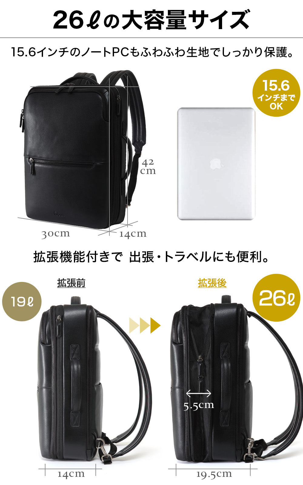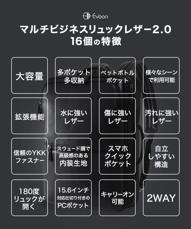 Evoon マルチビジネスリュックレザー2.0・容量19L~拡張時26L【まもなく予約開始・4月下旬までに入荷予定】