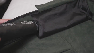 A:リュック背面のキャリーオンベルト内へ簡易的に収納することは可能でございます。下記の製品レビュー動画内約3分前後の部分にて説明がございます。