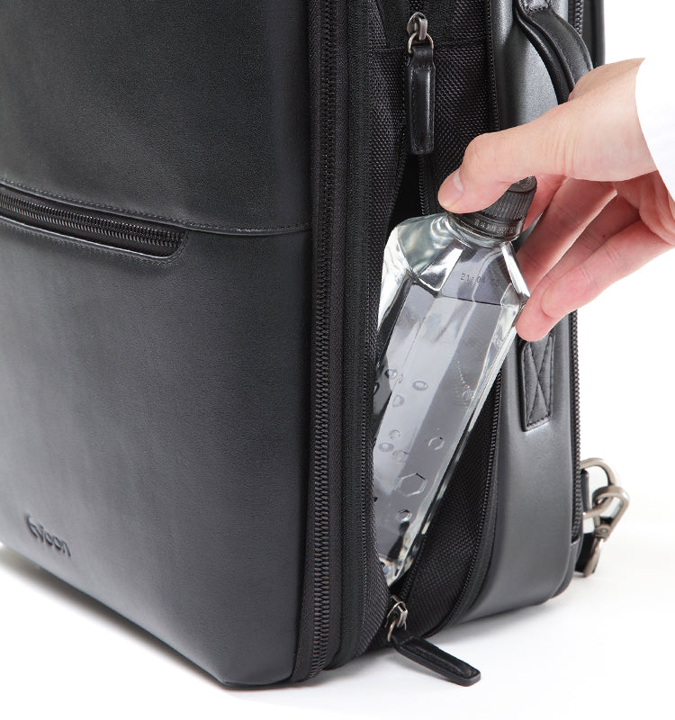 リュックの外側にペットボトルが見えない構造のボトルポケットを搭載し、ビジネスシーンをスマートにします。
