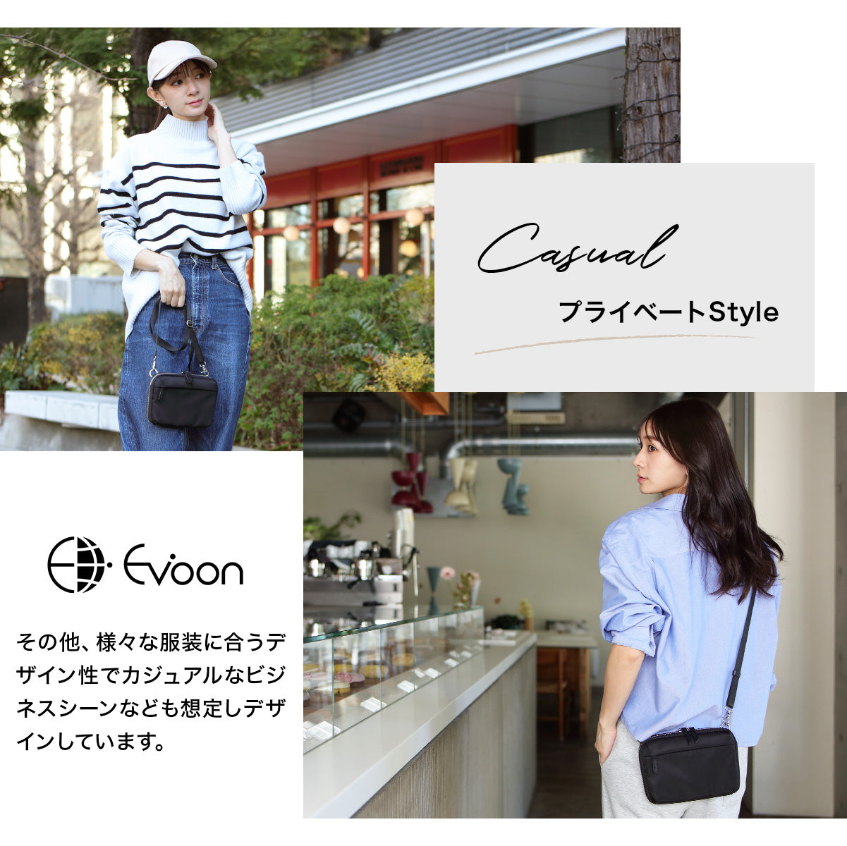 街中でもよく見かけるようになった、Evoon(エボーン)から女性向けの製品開発を企画し、ポーチとしての役割と、財布の機能も搭載したスマホポーチを開発しました。便利なだけではなくシンプルで飽きにくく、多くのお客様・多くの場面で使用できるデザイン性に仕上がっています。