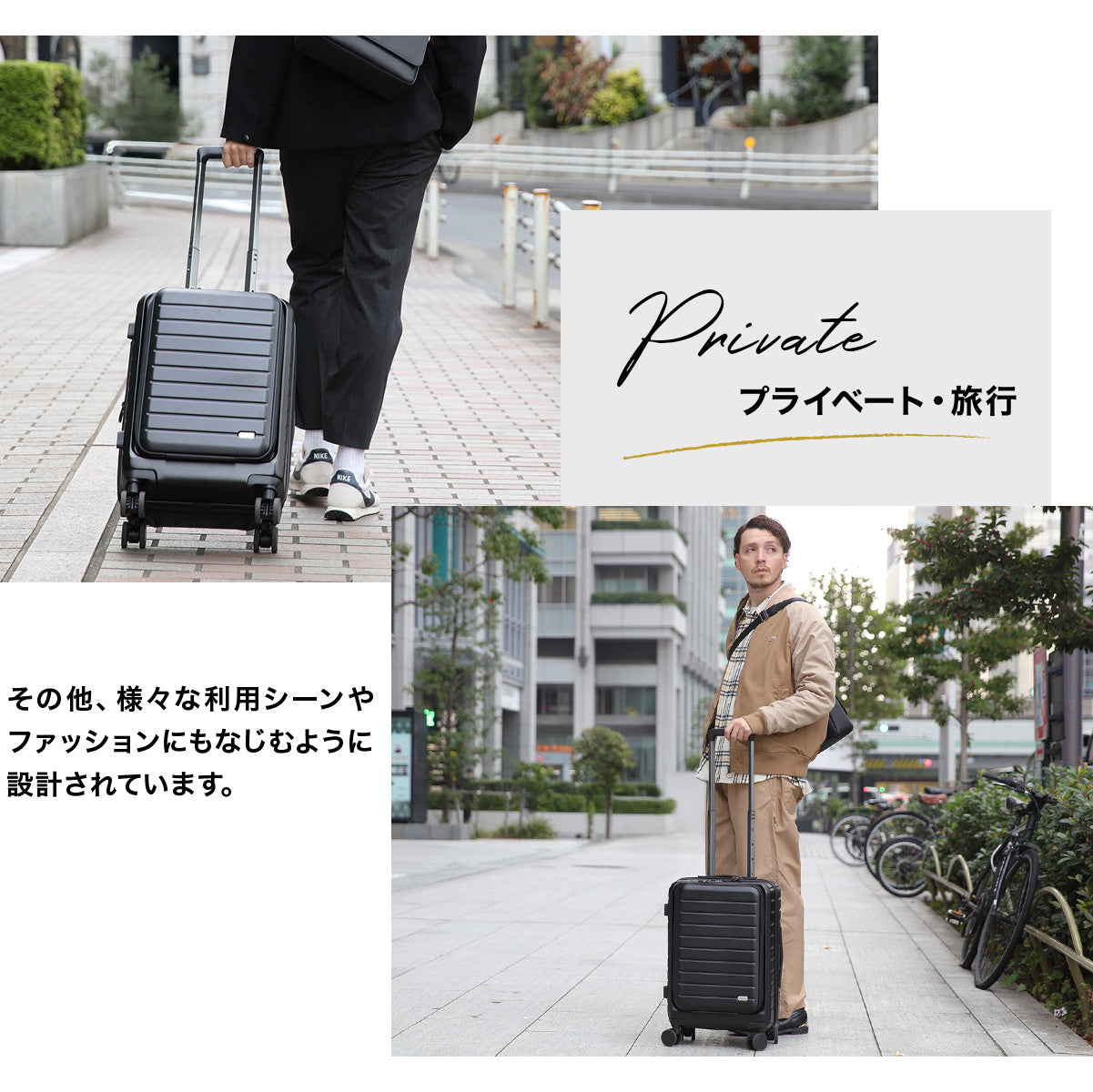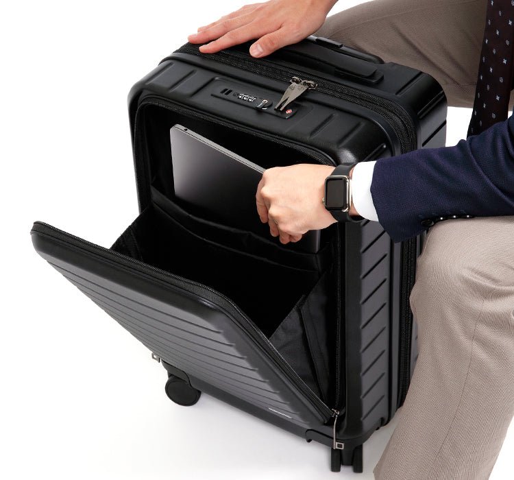 フロントオープン構造で手荷物検査やオープンスペースで必要な小物の出し入れをクイックに。15.6インチのPCも収納可能で衝撃が伝わりにくいPCポケットも搭載。扇マチ構造でガバッと開きすぎない設計に仕上げました。
