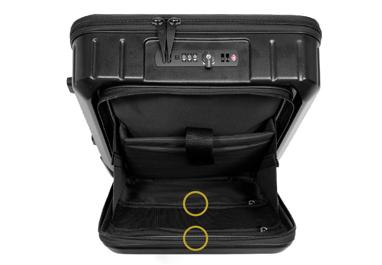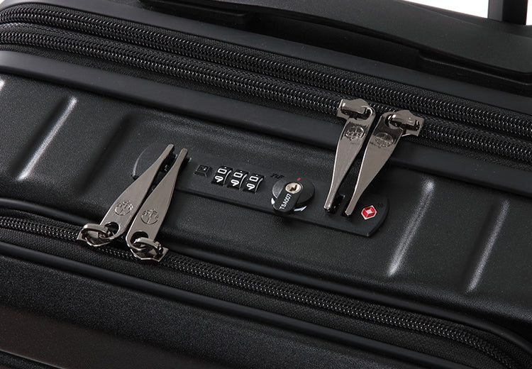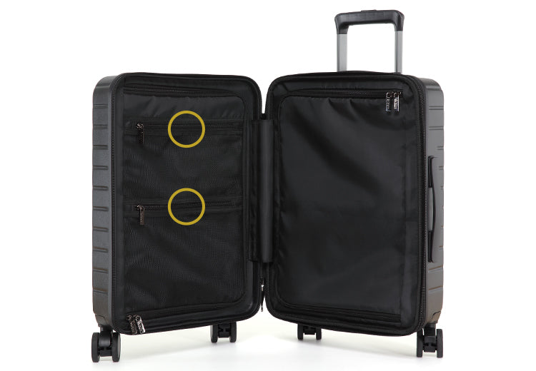 スーツケースの開け閉めの際に中の荷物がこぼれにくくなるように設計されています。中ファスナーと専用ポーチは中の収納物の目隠しの役割を果たし、スーツケースを開いた際に中身が見えずプライバシーを守ります。