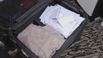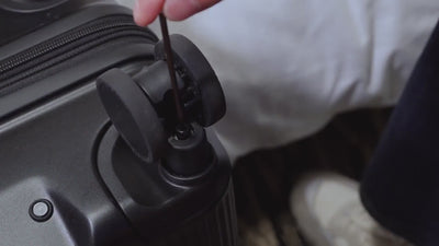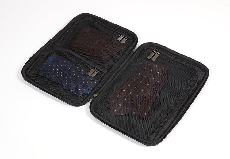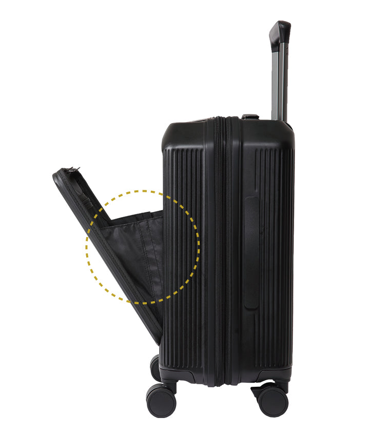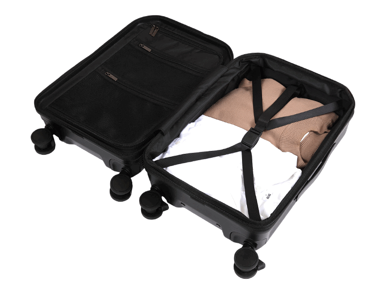 スーツケースの開け閉めの際に中の荷物がこぼれにくくなるように設計されています。中ファスナーと専用ポーチは中の収納物の目隠しの役割を果たし、スーツケースを開いた際に中身が見えずプライバシーを守ります。