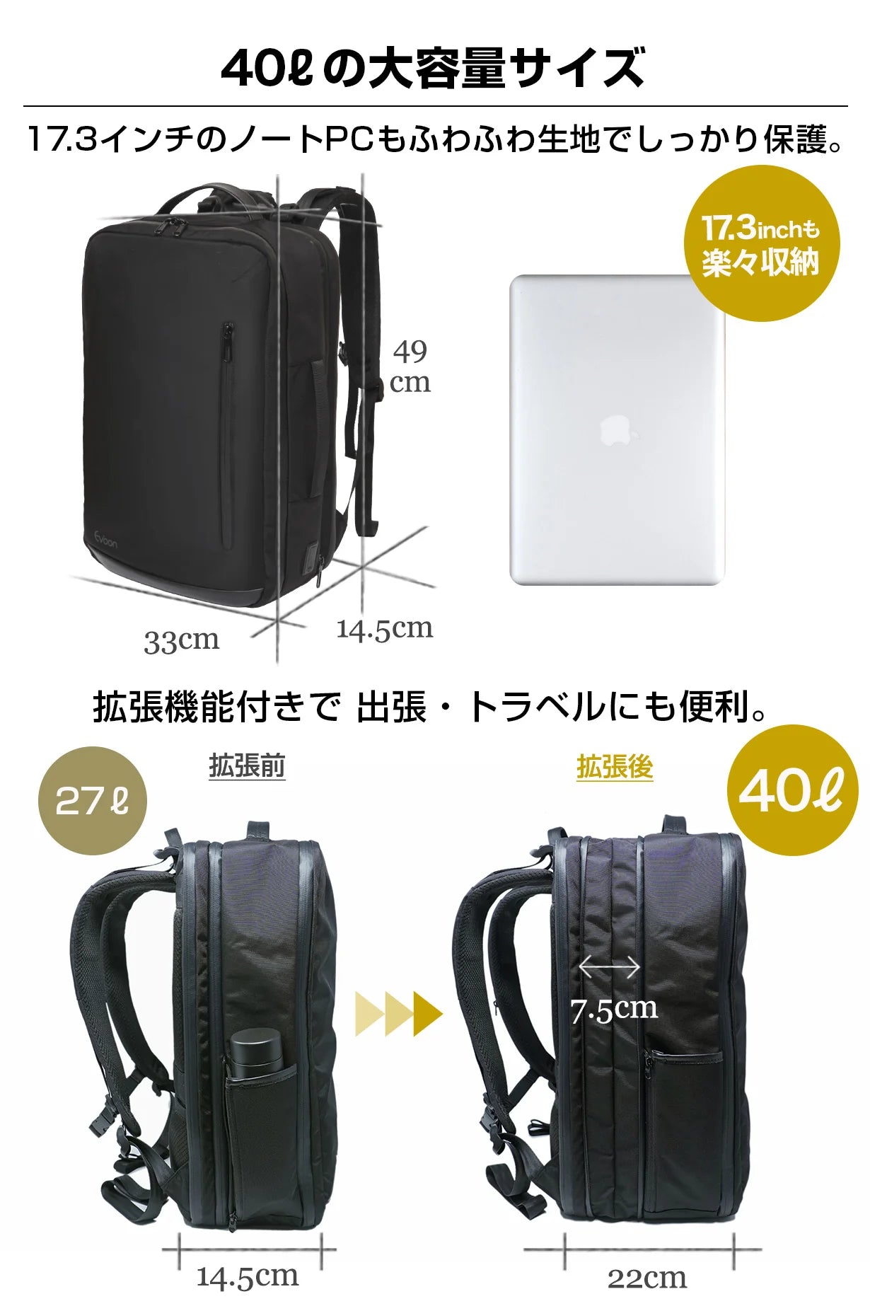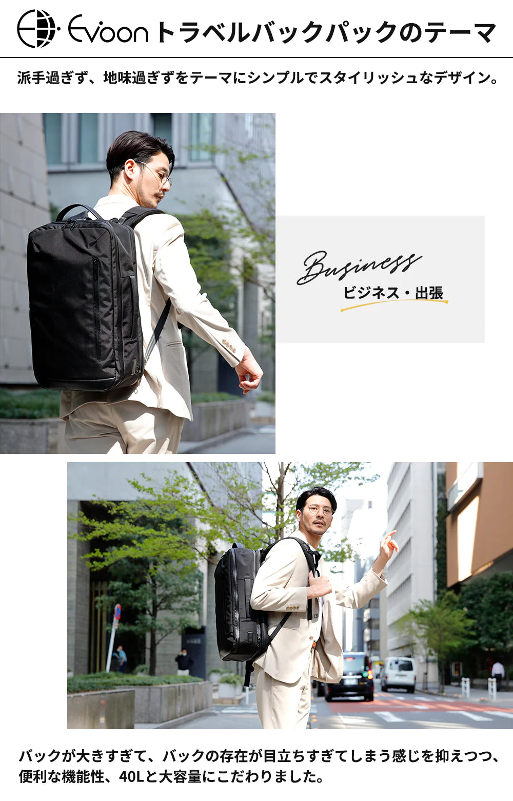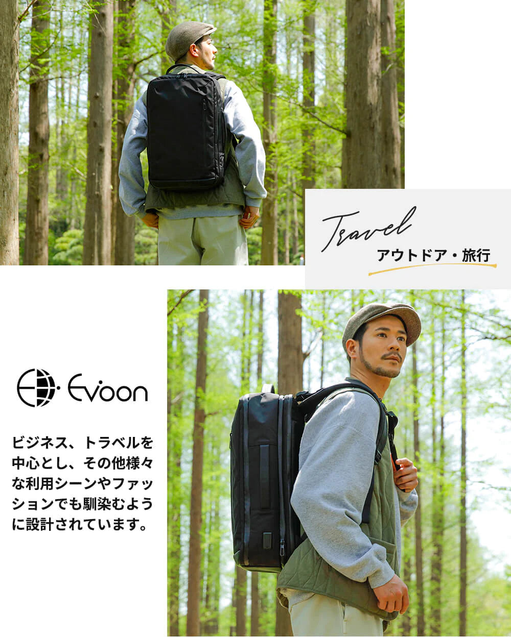 17.3インチのノートパソコンの収納や書類の整頓、それだけではなく泊りの出張や旅行・アウトドアにも最適。今回のEvoonは容量が40Lで主にトラベル向けに大容量にこだわりました。 圧倒的な収納力や使い勝手に喜びの声をこれまで多く頂いています。 これからは利用シーンによってバッグを使い分ける必要はなくなります。
