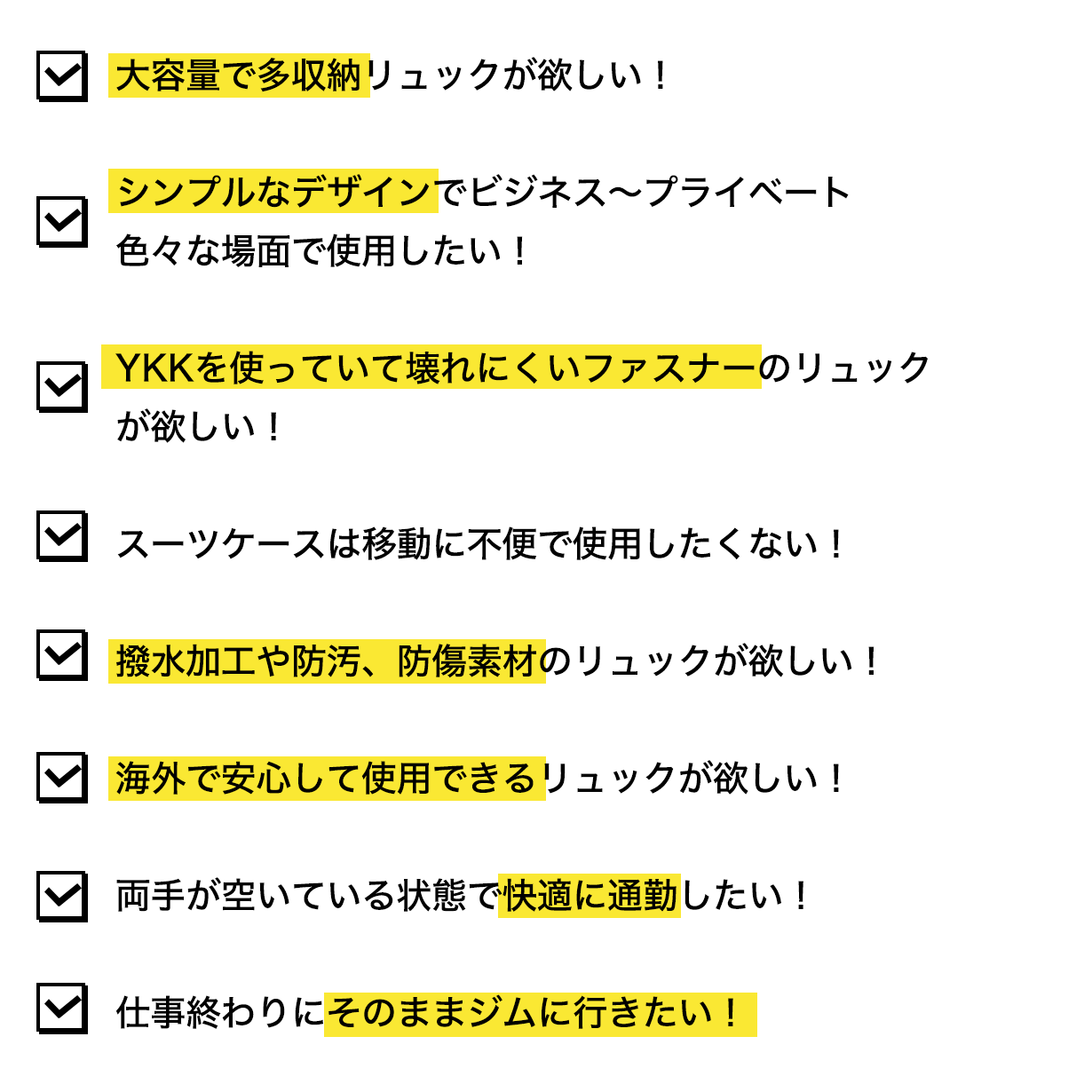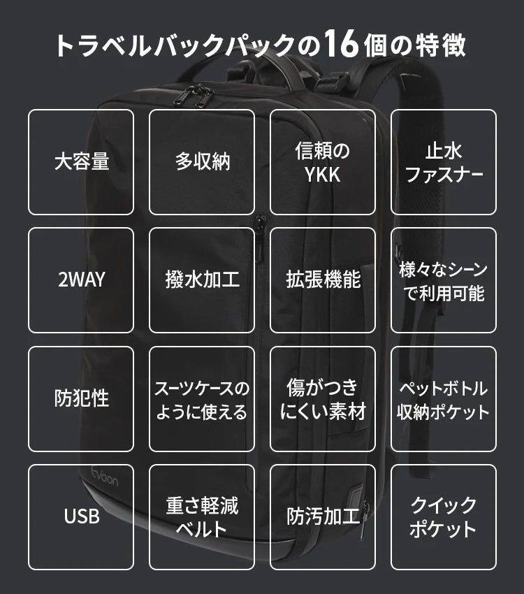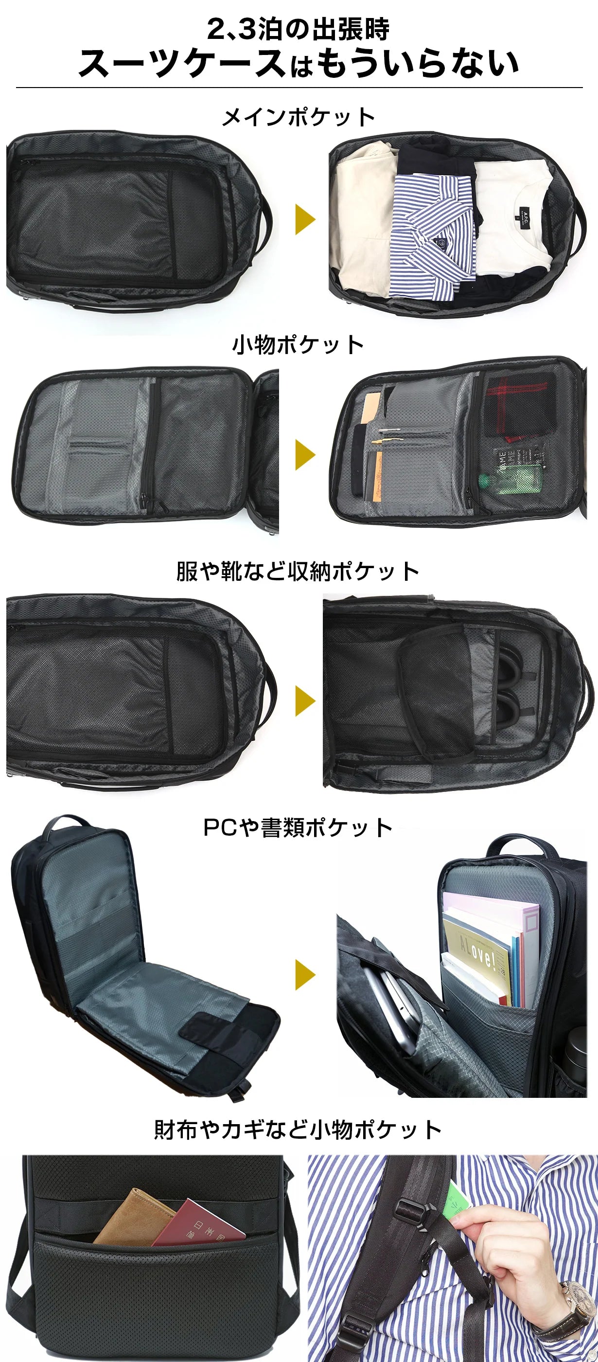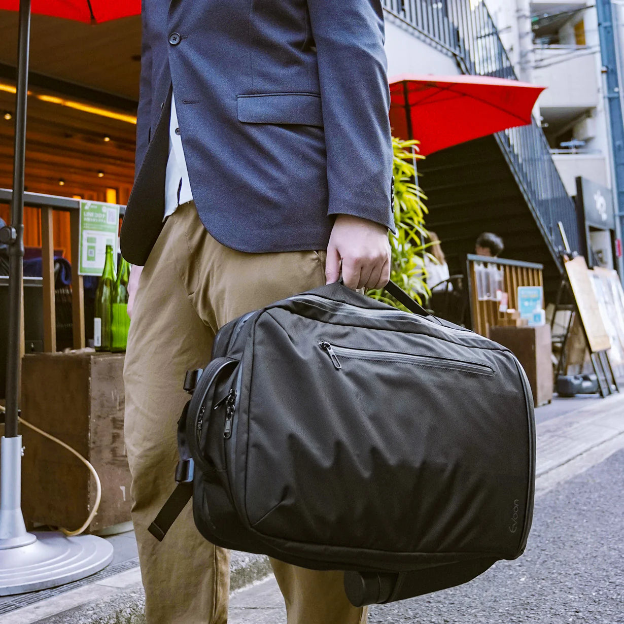 17.3インチのノートパソコンの収納や書類の整頓、それだけではなく泊りの出張や旅行・アウトドアにも最適。今回のEvoonは容量が40Lで主にトラベル向けに大容量にこだわりました。 圧倒的な収納力や使い勝手に喜びの声をこれまで多く頂いています。 これからは利用シーンによってバッグを使い分ける必要はなくなります。