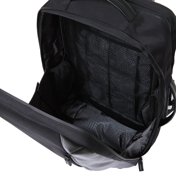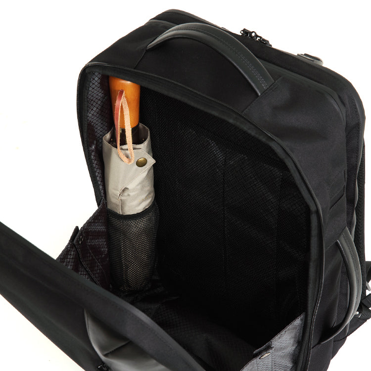 雨が降るかわからない時はリュックの内部に傘をしまうための サイドポケットを搭載。スマートに傘の持ち運びを可能に。
